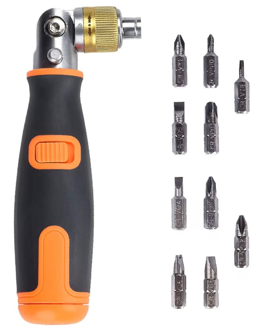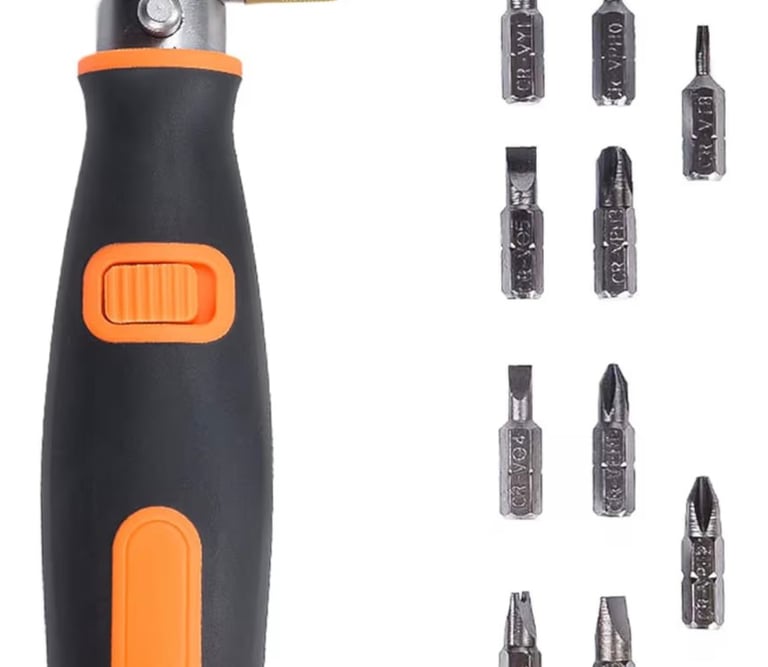 A versatile household ratcheting screwdriver set designed for easy assembly and everyday repairs. It features a bendable shaft for hard-to-reach angles, a smooth ratcheting mechanism to reduce effort, and a magnetic bit holder for secure fastening. The handle includes a built-in compartment to neatly store the interchangeable bits, making it practical, compact, and perfect for home DIY tasks.