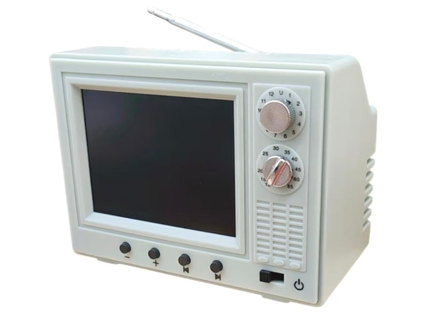 A realistic 1:12 scale miniature TV designed for dollhouse setups and DIY miniature scenes. This mini TV features a small LCD screen capable of playing video content and includes a 180° rotatable antenna for added detail and authenticity. USB rechargeable for convenient use, it adds a modern and interactive touch to dollhouse living rooms, bedrooms, or creative display settings.