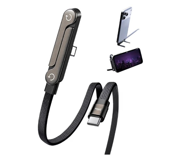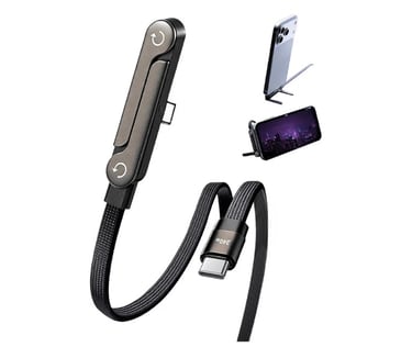 This 5-foot USB-C to USB-C cable delivers ultra-fast 240W charging power, making it ideal for the latest smartphones and high-performance devices. Designed with a right-angle connector for comfortable gaming and video watching while charging, it reduces cable strain and improves durability. What makes it unique is the invisible phone holder function, allowing you to prop up your device conveniently while charging. Compatible with iPhone 17 Pro Max, 16 and 15 series, Samsung Galaxy S25, S24 Ultra, and other USB-C devices, this cable combines speed, smart design, and everyday practicality.
