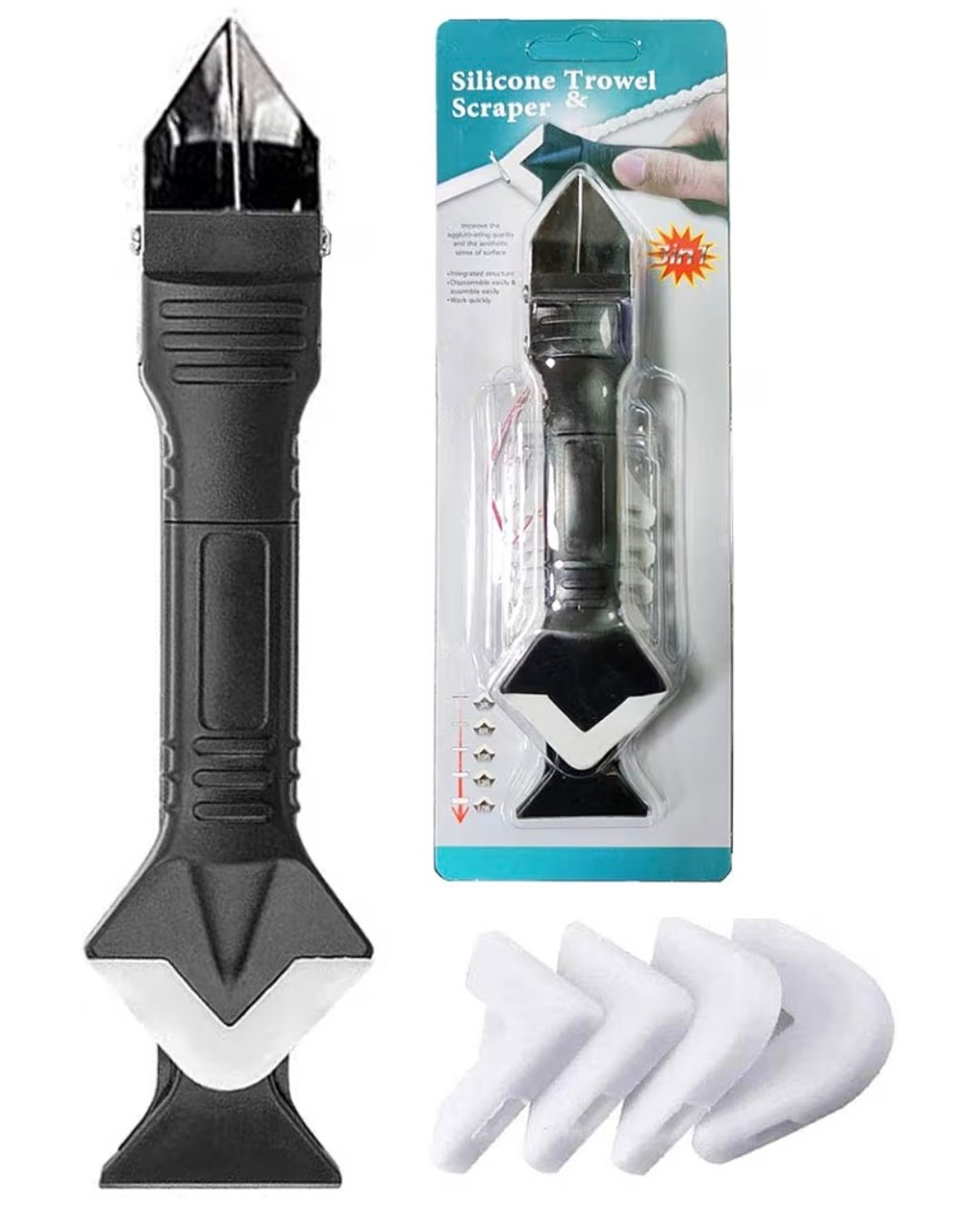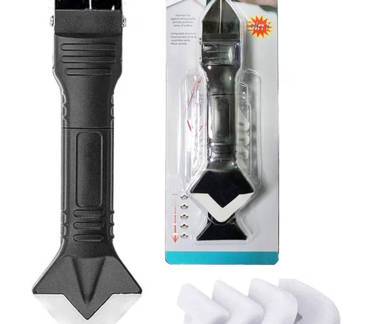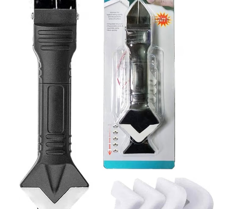 A compact 3-in-1 caulking kit designed to remove old sealant, smooth new caulk, and clean corners with precision. It includes a stainless-steel remover head, a silicone scraper, and interchangeable smoothing pads to help you achieve clean, professional edges on sinks, bathtubs, windows, and tiles. Easy to use, durable, and perfect for DIY repairs or professional finishing work.