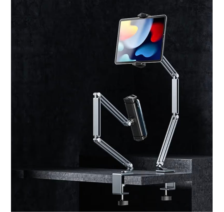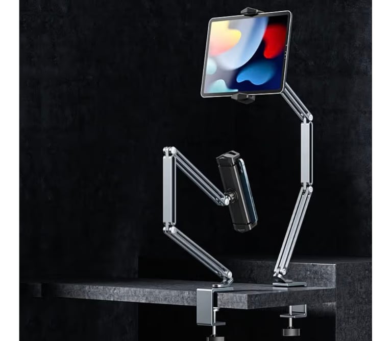 A sturdy and flexible tablet holder designed for hands-free viewing in bed, on the sofa, or at a desk. Features a long 36-inch black metal rod, full 360° rotation, and multi-angle adjustment to get the perfect viewing position. Compatible with iPad Pro 12.9 inch, iPad Air, iPad Mini, and most tablets, making it ideal for watching, reading, gaming, or online classes.