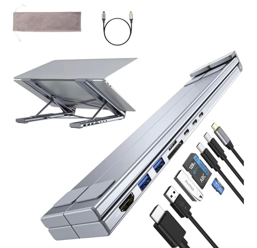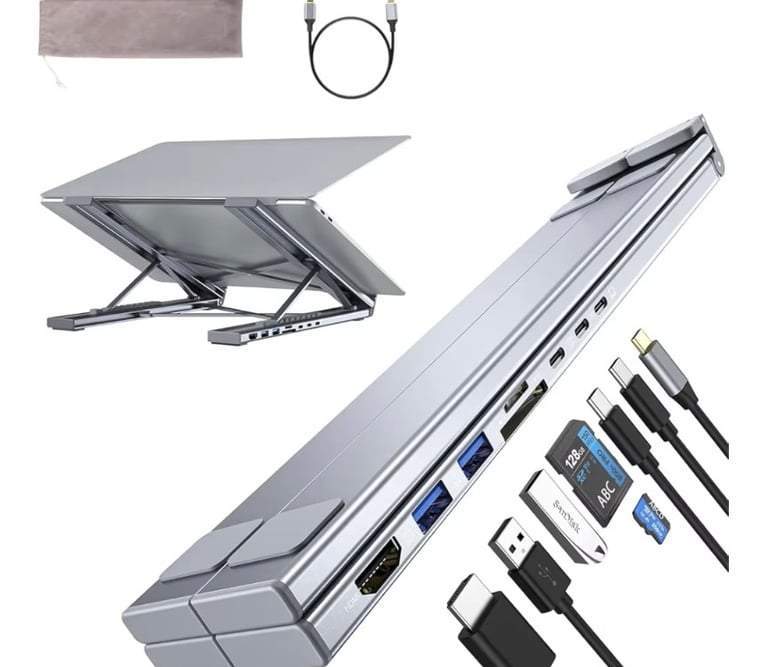 The 8-in-1 USB-C Laptop Docking Station Stand combines a portable laptop stand with a powerful multiport hub, giving you both ergonomic comfort and expanded connectivity in one device.