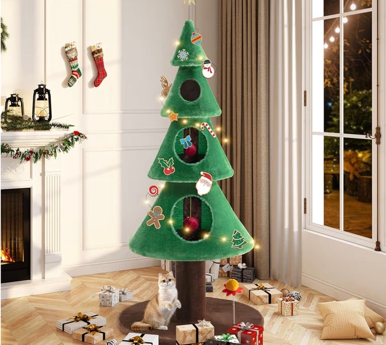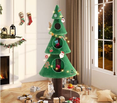 The Allewie 63-Inch Cat Tree is a delightful blend of a 5ft Christmas tree and a multi-level cat tower! Designed with 3 cozy condos, multiple perches, and soft beds, it gives your feline friends endless fun and comfort. Perfect for the holidays or year-round play, this green festive cat tower doubles as a decorative Christmas tree, bringing charm and activity to your home while keeping your cats happy and entertained.