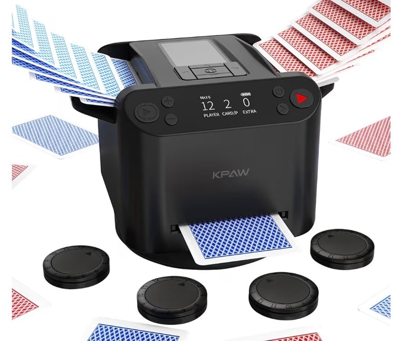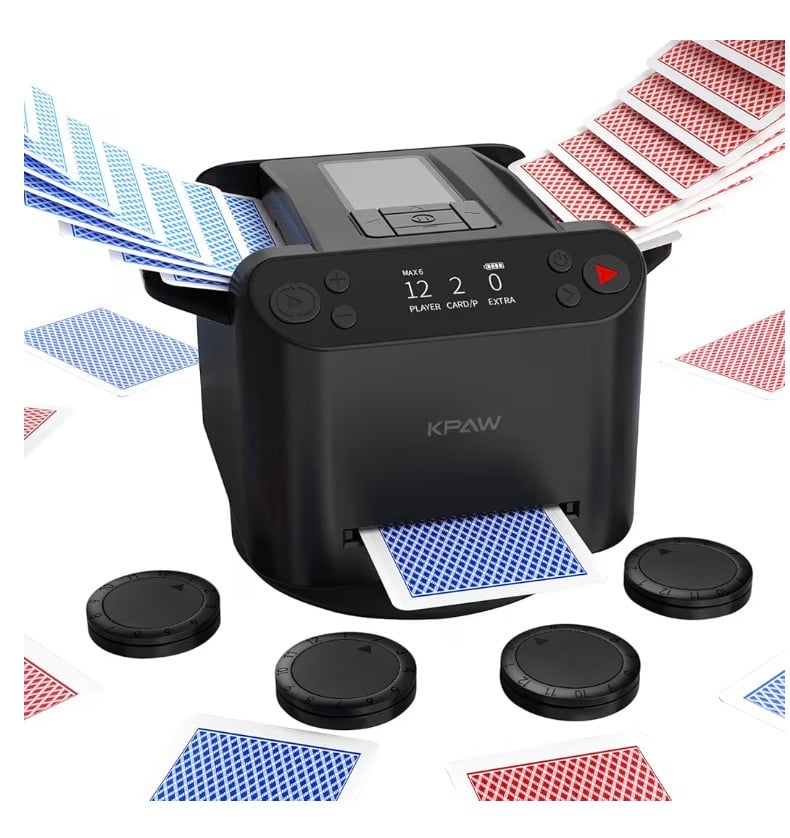 A smart automatic card shuffler and dealer designed to make game nights faster and more fun. Supporting 1–2 decks and up to 12 players, it shuffles and deals cards evenly with adjustable 360° or 180° distribution. Equipped with 4 drawing remotes and built-in gameplay modes, it’s ideal for poker, UNO, Phase 10, Skip-Bo, Rummy, and other popular card games. Perfect for family gatherings, parties, and competitive play.