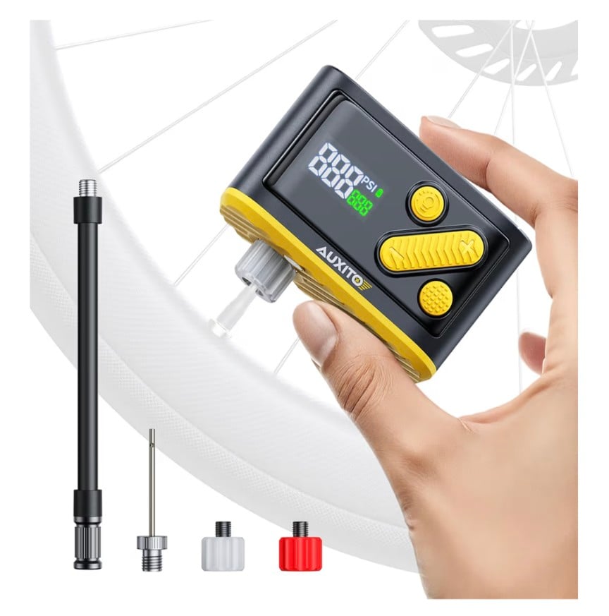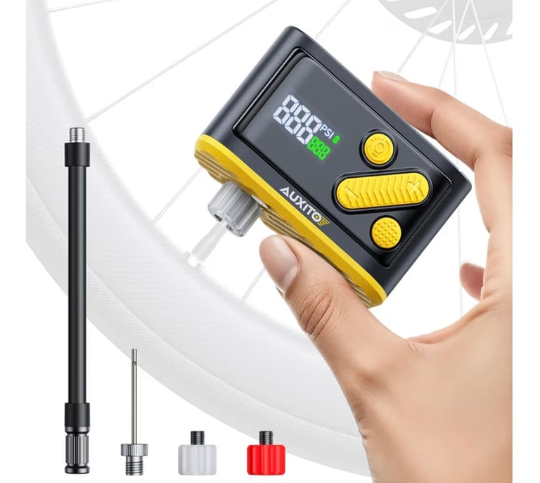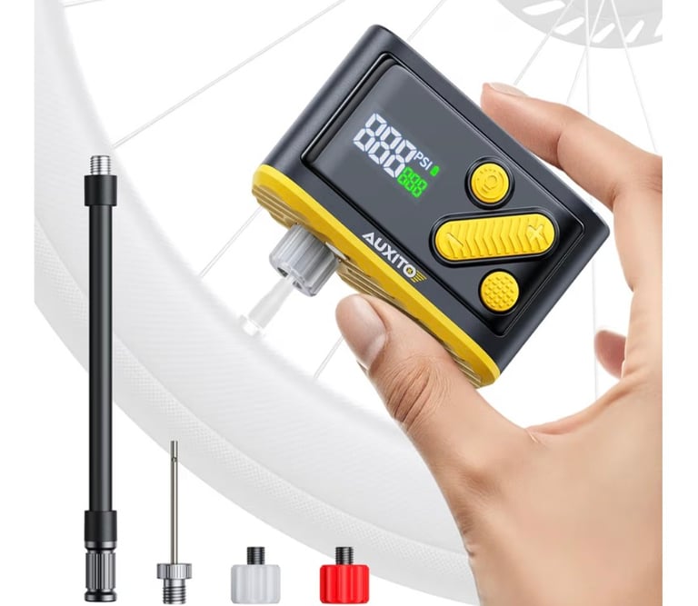 A compact and ultra-light mini electric bicycle pump designed for fast and convenient inflation on the go. The AUXITO AB1 features a built-in pressure gauge, 20-second fast inflation, and a powerful 120 PSI output. Compatible with both Presta and Schrader valves, it’s perfect for road bikes, mountain bikes, and e-bikes. Weighing only 0.48 lb, it easily fits into a backpack or saddle bag, making it an essential cycling accessory.