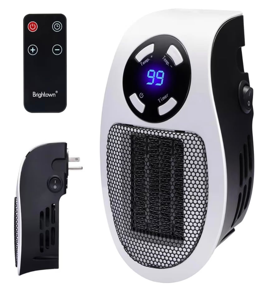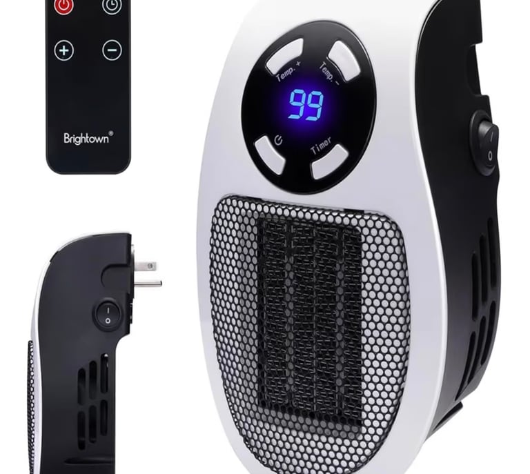 A compact 450W wall outlet heater designed to deliver efficient warmth without taking up floor space. It features a clear LED display, adjustable thermostat, 12-hour timer, and a convenient remote control. Ideal for bathrooms, bedrooms, and offices, providing quiet and energy-efficient indoor heating.