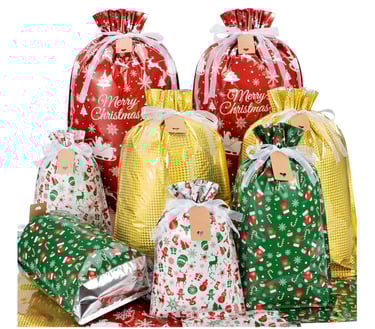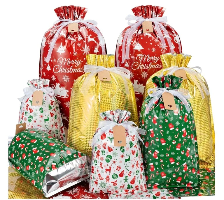 The Asoulin Christmas Drawstring Gift Bags set includes 32 festive foil bags in large, medium, and small sizes, perfect for wrapping gifts, candies, or party favors. Each bag comes with a matching tag and a drawstring closure for quick and elegant packaging. Ideal for Christmas, birthdays, and holiday parties — add sparkle and joy to every gift!