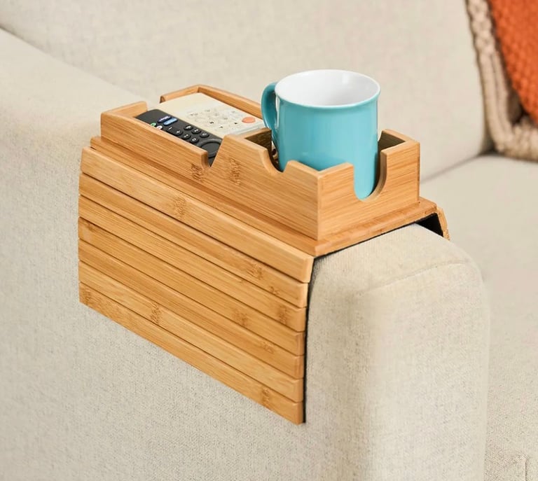 The Couch Cup Holder Tray is a portable sofa arm table designed to keep drinks, snacks, and phones within easy reach. With an anti-spill design, removable tray, and remote control holder, it’s the perfect organizer for relaxing on the couch.