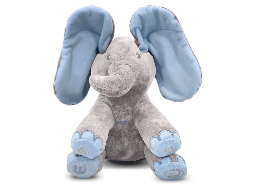 The Dimple Kyle Peek-A-Boo Elephant Toy is an adorable interactive plush designed to entertain and engage babies and toddlers. This cute elephant plays a fun peek-a-boo game, moving its ears while singing cheerful songs to delight little ones.