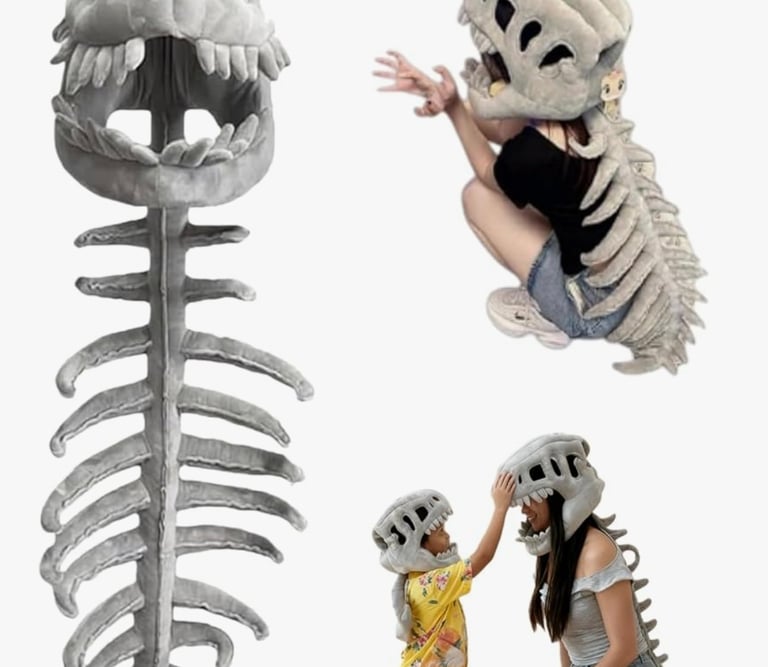 The Dinosaur Skeleton Costume with 3D Spinosaurus Skull Mask is a fun and eye-catching outfit designed for Halloween, cosplay events, themed parties, and imaginative dress-up play. The costume features a detailed Spinosaurus skull mask that gives a realistic dinosaur skeleton look, along with a soft plush spine tail that adds a playful prehistoric style.