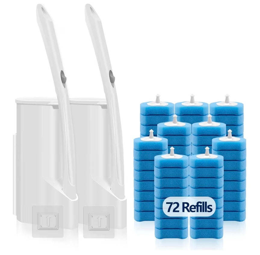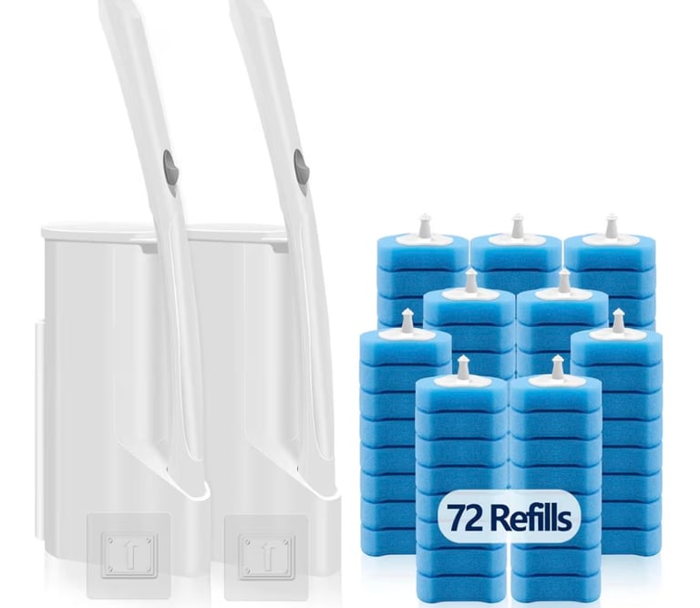 A complete toilet cleaning system designed for hygienic and convenient deep cleaning. This 2-pack set includes two toilet bowl wands, two storage caddies (wall-mount compatible), and 72 disposable brush refills for long-lasting use. The disposable heads help reduce mess and bacteria buildup, while providing effective scrubbing power for tough stains and buildup. Ideal for keeping bathrooms clean with minimal contact and easy maintenance.