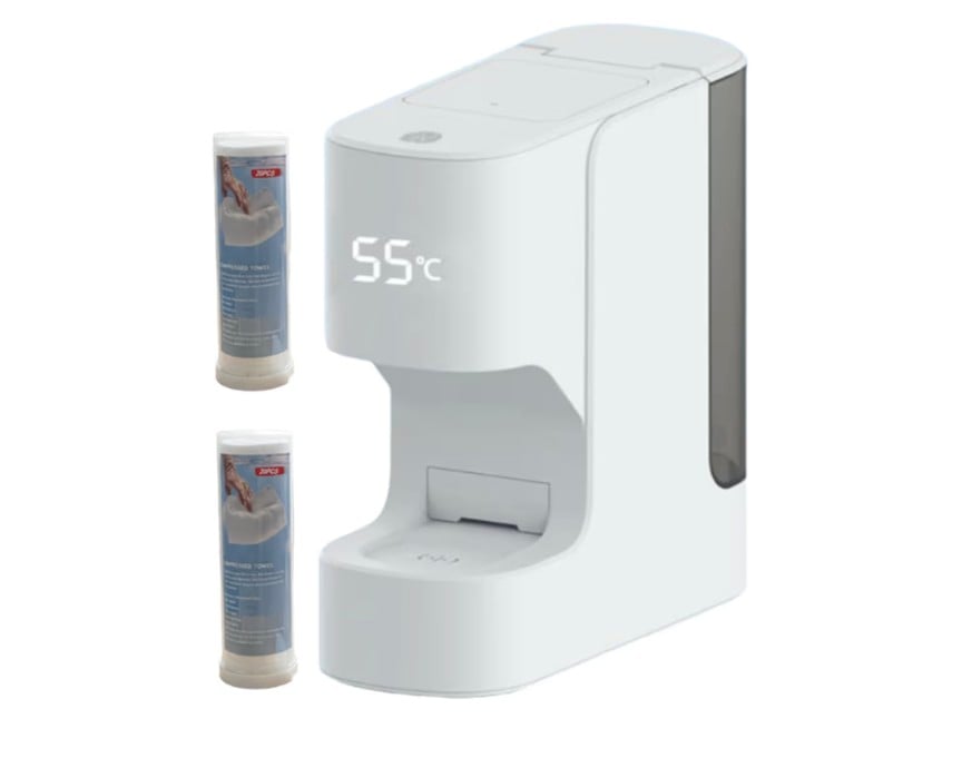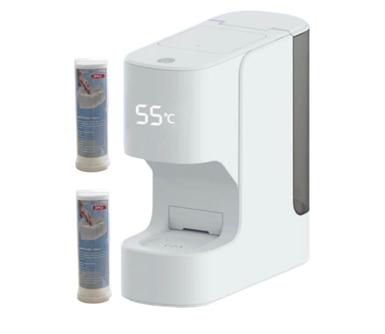 A compact hot towel heater designed to automatically dispense and warm compressed disposable towels in just 5 seconds. Maintaining a constant 55°C temperature, it delivers hygienic, soothing warmth with helpful voice alerts. Perfect for spas, salons, and home use, offering fast, clean, and comfortable towel warming.