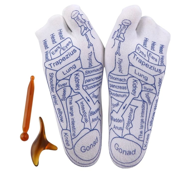 The Foot Reflexology Sock Set with Massage Tool is designed to promote relaxation and overall wellness. Featuring acupressure socks that map out foot reflex points and a massage pen tool, it helps relieve stress, body aches, and tension naturally. Easy to use at home, this set combines comfort with the benefits of reflexology, making it a great choice for daily health and relaxation.
