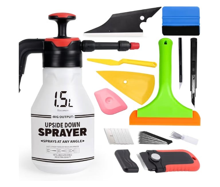 A complete window tint and vinyl wrap installation kit designed for precision and efficiency. This set includes a water pump pressure sprayer for smooth film application, professional squeegees for bubble removal, a utility craft knife with replacement blades for accurate trimming, and a razor blade scraper for surface preparation. Ideal for car window tinting, vinyl wrapping, decals, and DIY projects, it provides the essential tools needed for clean, professional-looking results.