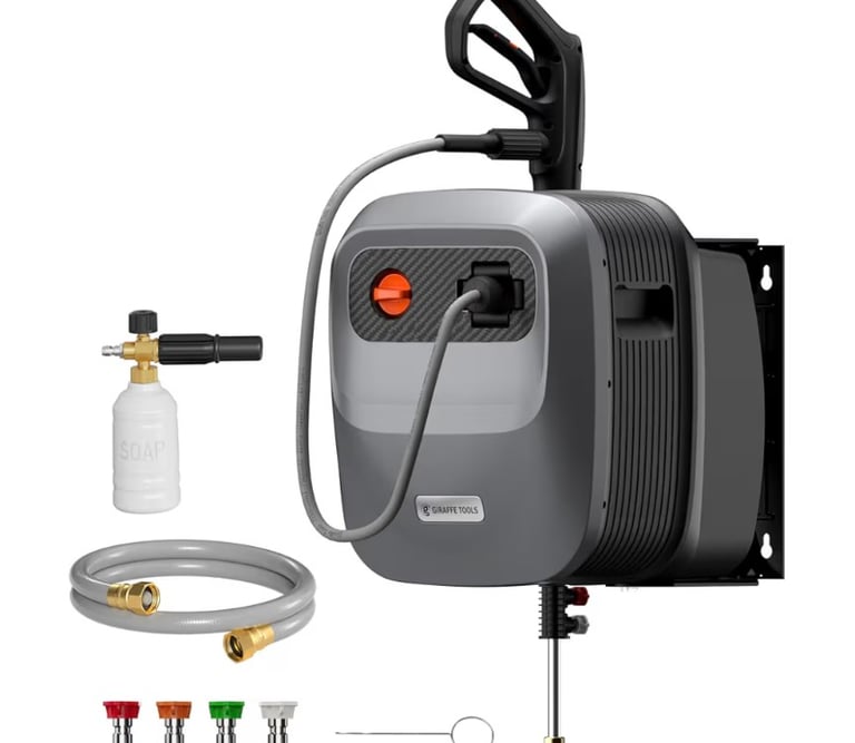 A powerful wall-mounted pressure washer designed for convenience, performance, and clean storage. Delivering up to 2500 PSI and 2.2 GPM, it handles tough cleaning jobs on cars, floors, fences, patios, and outdoor surfaces with ease. The 180° swivel wall mount and auto-retract 65FT hose reel provide smooth operation and clutter-free storage, while the included 5 nozzles let you switch effortlessly between cleaning tasks.