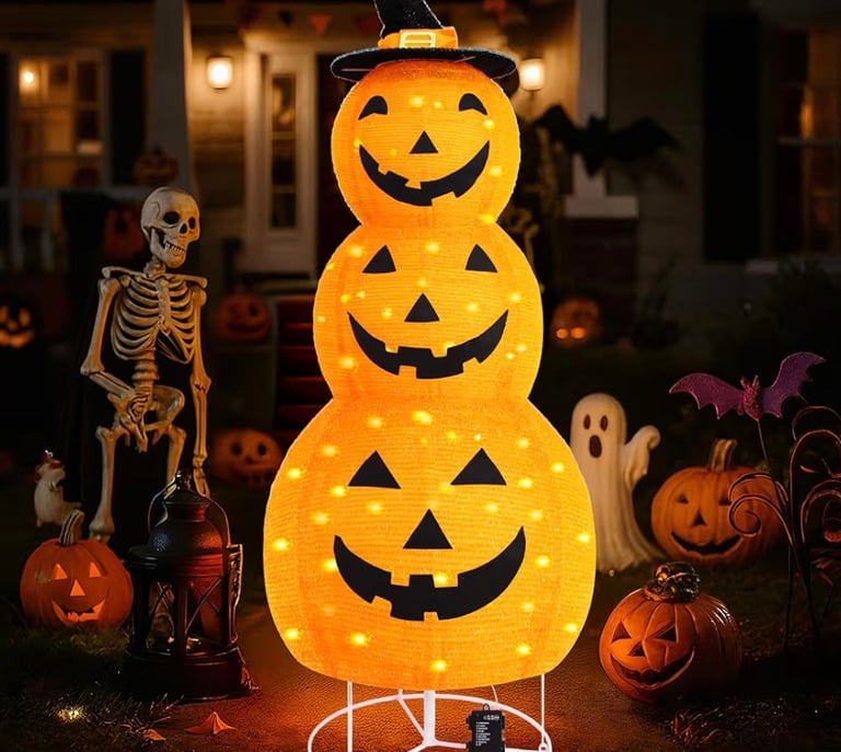 The Halloween Pumpkin Decorations feature a battery-operated, pre-lit collapsible Jack-o’-Lantern with 100 bright LED lights and 8 lighting modes, perfect for creating a spooky and festive vibe. Its pop-up design makes setup easy and storage simple — ideal for indoor or outdoor Halloween parties, yards, and fall decorations.