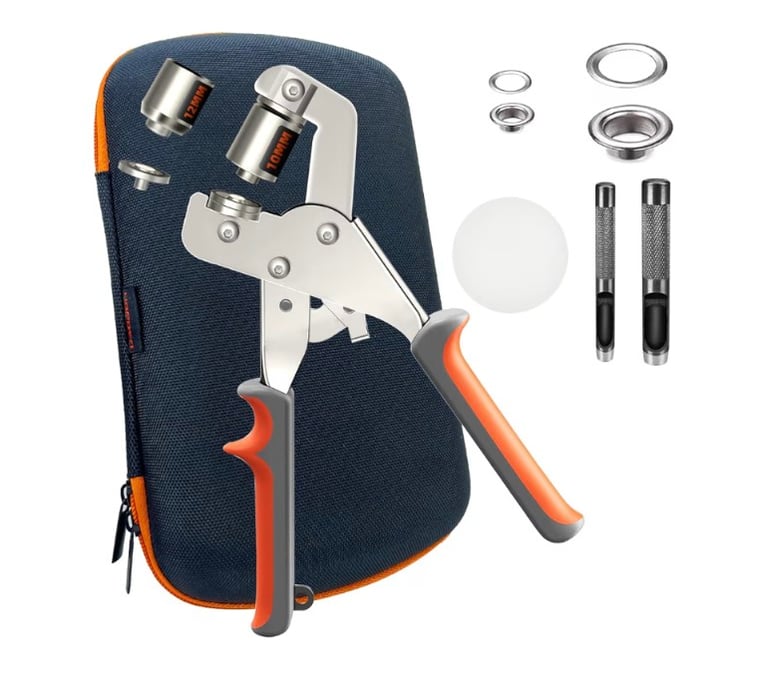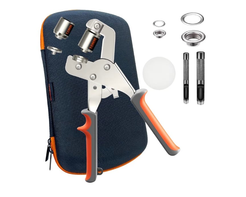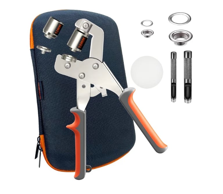 A complete heavy-duty grommet and eyelet tool kit designed for DIY tarp repair and installation. It includes a storage bag, 200 pieces of 10 mm grommets and 200 pieces of 12 mm grommets, providing strong, clean reinforcement for tarps, canvas, banners, and fabric projects. Ideal for home repairs and professional use.
