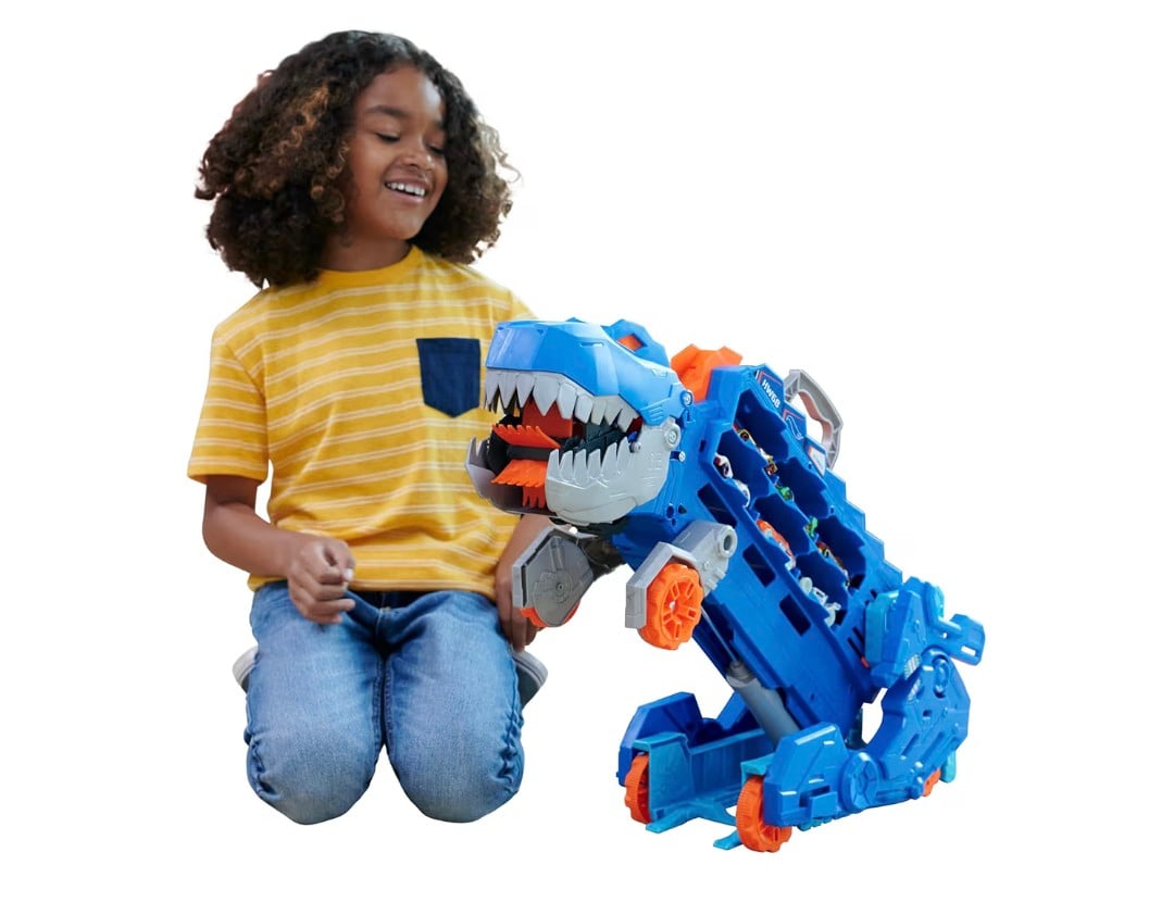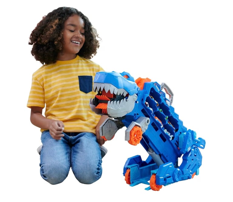 Kids can load cars into the transporter, then unleash the T-Rex for thrilling racing and adventure. The interactive design encourages creativity, storytelling, and hands-on play.