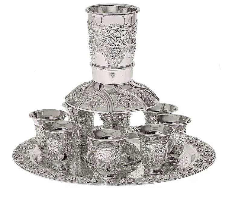 An elegant silver-plated Kiddush wine fountain beautifully decorated with traditional Jerusalem motifs. Designed for Shabbat and holiday blessings, it features a central Kiddush cup that gently fills six surrounding cups, creating a graceful cascading flow. Perfect for family gatherings and festive occasions, this decorative set combines meaningful tradition with refined craftsmanship, making it a thoughtful gift for weddings, housewarmings, or Jewish celebrations.