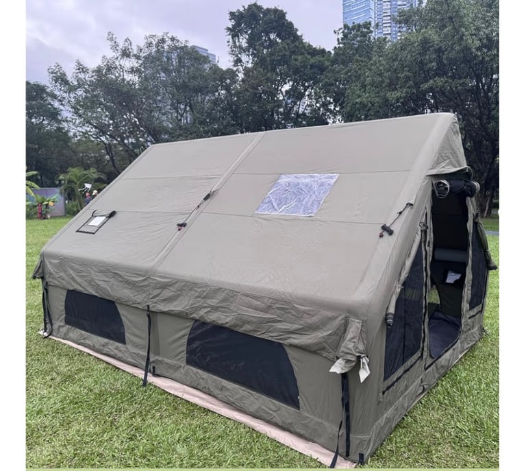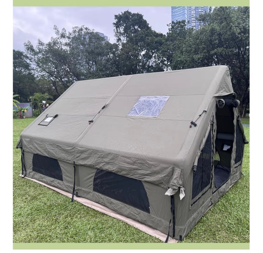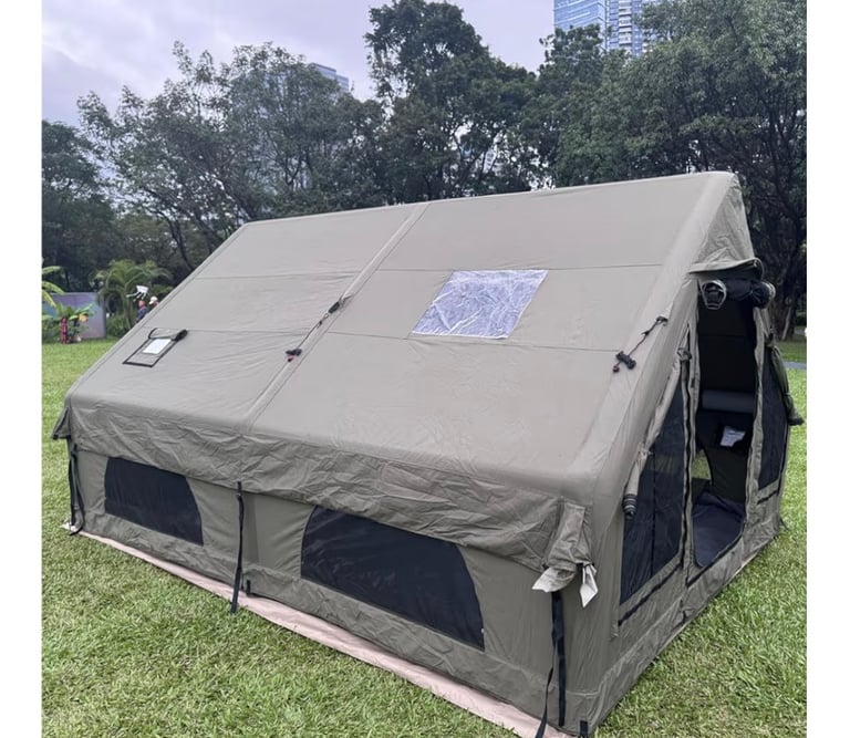 A premium inflatable camping tent made from high-quality technology cotton canvas, offering excellent breathability and full waterproof protection. Designed for comfort and space, this luxury tent supports 4 to 12 people and covers a generous 12㎡ area, making it perfect for family camping and long outdoor stays. Features a skylight for natural light and stargazing, plus a stove jack for safe heating in cold weather. Easy to set up with an inflatable structure and built to handle different outdoor conditions.