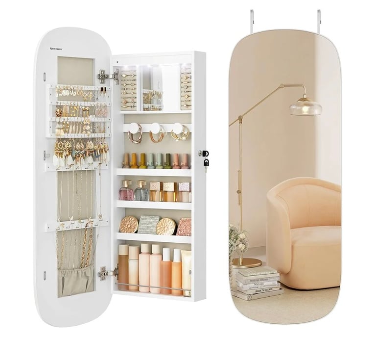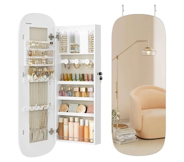 The LED Jewelry Organizer Cabinet is a luxurious all-in-one mirror and storage solution designed to keep your jewelry safe and beautifully displayed. It features a lockable door, LED lighting, and an interior mirror for easy accessorizing. With a rounded wide mirror and elegant white finish, it mounts easily on a wall or door — perfect for adding style and functionality to any room.