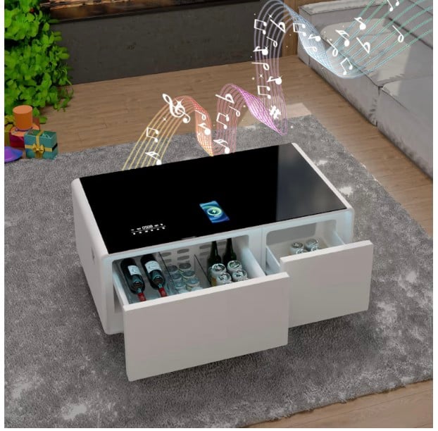 A modern multifunctional coffee table designed to upgrade your living room experience. This smart table features a built-in mini fridge to keep drinks chilled and within reach, along with 15W wireless charging for compatible devices. It also includes USB charging ports and integrated speakers, combining convenience, entertainment, and sleek contemporary design. With dimensions of 23" D x 41.5" W x 18.2" H, it’s perfectly sized for everyday living while offering smart storage and tech integration.