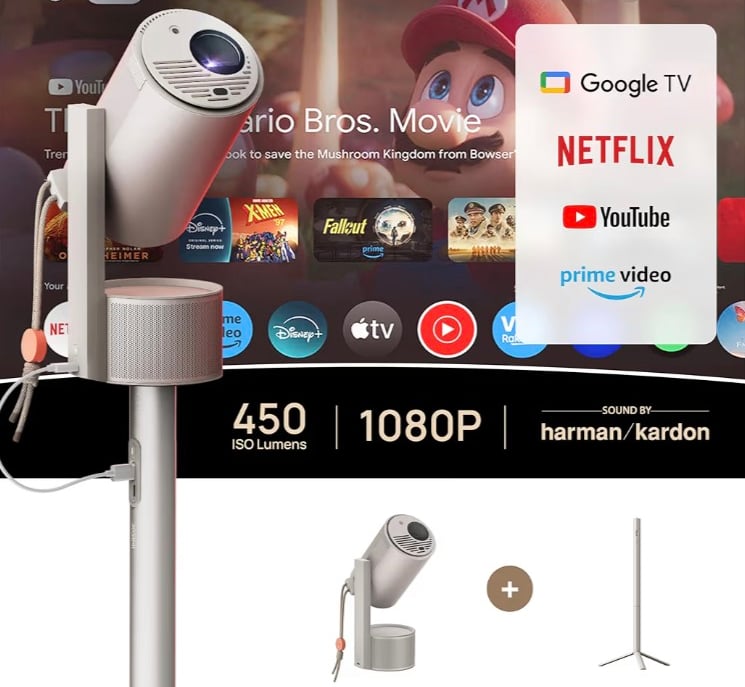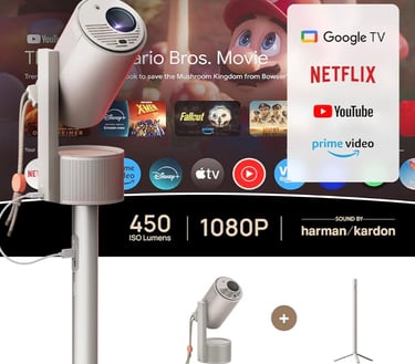 The MoGo 3 Pro Outdoor Projector brings cinematic brilliance anywhere you go! Featuring 450 ISO Lumens brightness, 2x5W Harman Kardon speakers, and Google TV with licensed Netflix, it delivers an immersive movie experience indoors or outdoors. With a 2.5-hour built-in battery, ISA 2.0 image auto-adjustment, and a PowerBase adjustable stand, this sleek projector offers portability, performance, and smart entertainment β all in one compact design.