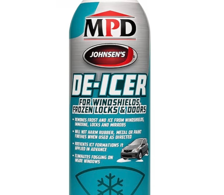 A fast-acting de-icer spray designed to quickly melt ice and frost on windshields, locks, mirrors, and car doors. Its advanced formula helps prevent refreezing and reduces fogging, improving visibility and safety in cold weather. Safe to use on paint, metal, rubber, and glass, this 10 oz aerosol can is a reliable winter essential for cars, trucks, and daily cold-weather driving.