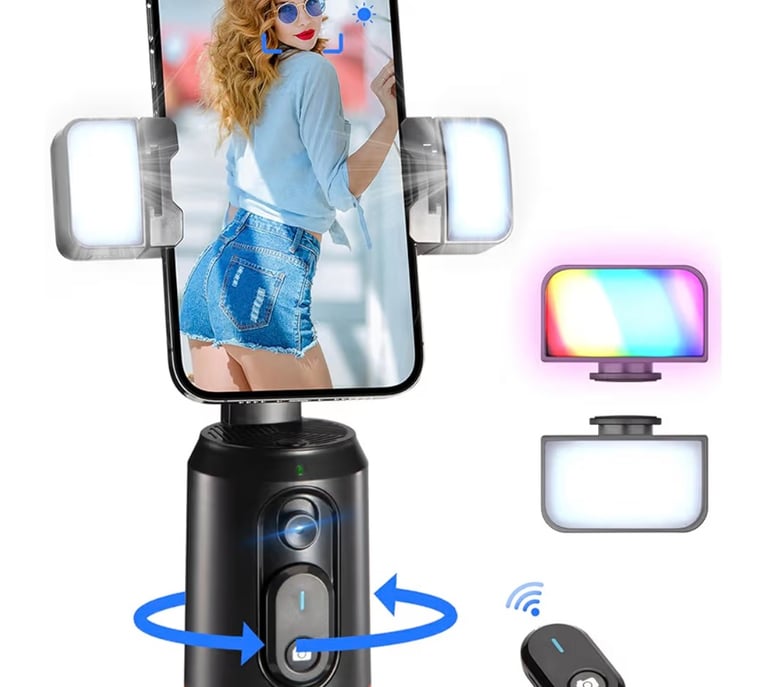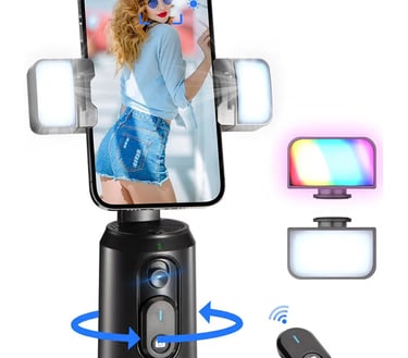 The MQOUNY Auto Face Tracking Phone Holder takes your content creation to the next level! With 360° rotation, AI-powered face and body tracking, and a built-in rechargeable light, this smart tripod automatically follows your movements — keeping you perfectly centered while filming. Ideal for live streaming, vlogging, TikTok, or online meetings, it also includes a wireless remote for hands-free control. Compact, rechargeable, and super smart — your personal cameraman for every video!
