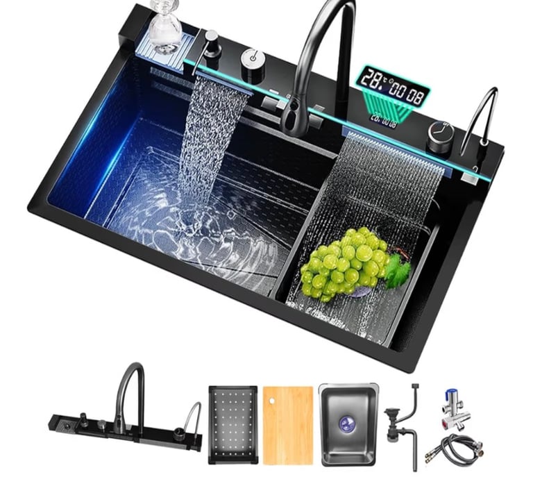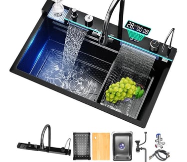 A premium multifunction kitchen sink designed for modern kitchens. This NOYHHAV single-bowl stainless steel sink can be installed as an undermount or countertop sink and comes with a complete workstation set, including a drain basket, cutting board, vegetable sink, and a multi-function pull-out faucet. Finished in elegant black, it offers durability, efficient drainage, and smart space-saving functionality for everyday cooking and cleaning.