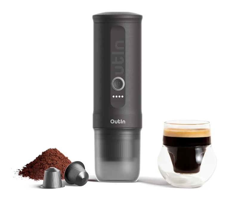 The OutIn Nano Portable Electric Espresso Machine is a compact and powerful coffee maker designed for coffee lovers on the go. With its self-heating technology and USB-C charging capability, it allows you to brew rich and flavorful espresso anywhere — whether you're camping, traveling, hiking, or working at the office. Compatible with both ground coffee and NS capsules, this portable machine delivers convenience and flexibility in one sleek design. Its lightweight and travel-friendly size makes it easy to carry in backpacks or car compartments, making it the perfect companion for outdoor adventures and daily commuting.