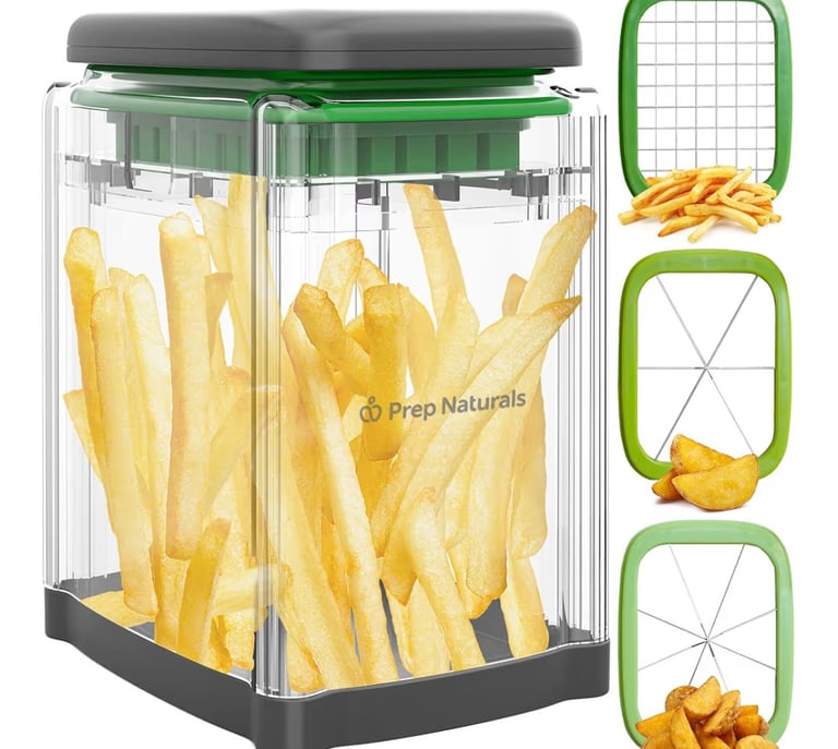 The Prep Naturals 3-in-1 French Fry Cutter is a versatile kitchen tool perfect for slicing and dicing potatoes, vegetables, and more. It comes with interchangeable blades to make fries, cubes, or slices easily. The sturdy design ensures smooth cutting without much effort, and the included safety glove adds extra protection while prepping food. Ideal for home cooks who want consistent results with minimal mess.