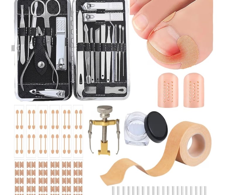 This professional ingrown toenail correction kit is designed to provide effective and convenient foot care at home. It includes essential pedicure tools, ingrown toenail correction patches, nail clippers, and a nail file—all neatly stored in a compact travel storage box. The tools help relieve discomfort caused by ingrown toenails while promoting proper nail growth and healthy feet. Ideal for regular maintenance or on-the-go use, this kit offers a safe, hygienic, and practical solution for personal foot care without frequent salon visits.