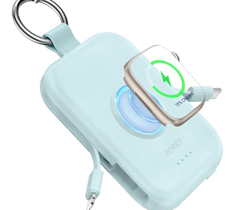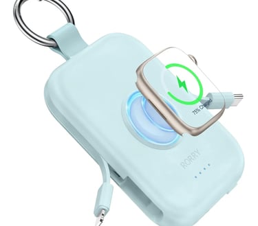 The RORRY Portable Charger is a compact 5000mAh power bank with built-in cables, perfect for charging your Apple Watch and iPhone on the go. Its travel keychain design makes it ultra-convenient for trips, commutes, or emergencies. Sleek, lightweight, and fast-charging — a true travel essential.