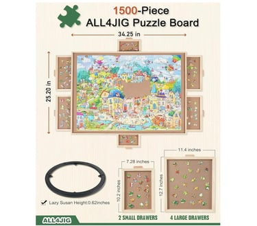 This 1500-piece rotating puzzle board is a dream come true for puzzle lovers! Featuring a smooth 360° Lazy Susan rotation, 6 slide-out drawers for sorting pieces, and a protective cover to keep your progress safe — it’s both functional and elegant. Made of durable wood, this portable jigsaw puzzle table (25"x34") is perfect for adults and makes an ideal birthday gift for moms or puzzle enthusiasts.