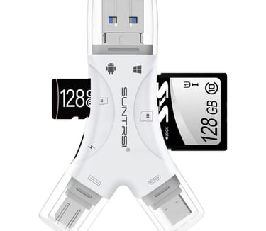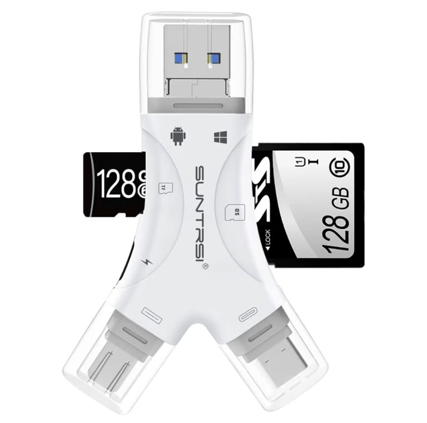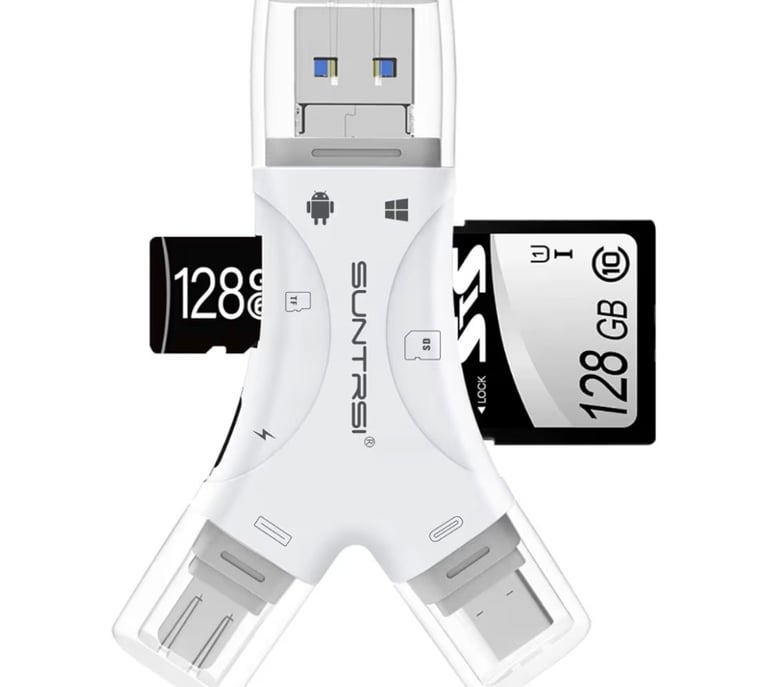 Transfer photos, videos, and files effortlessly with this 4-in-1 SD and Micro SD card reader! Designed for ultimate compatibility, it supports iPhone, iPad, Android, Mac, PC, and cameras. Ideal for trail camera viewing or on-the-go data access, this compact adapter ensures fast, stable file transfers anywhere you need them.