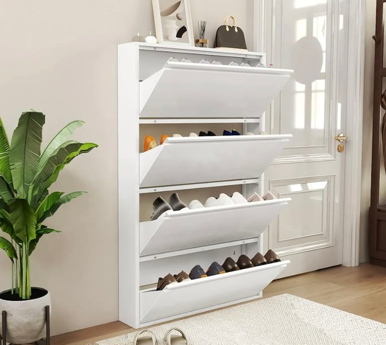 The Shoe Storage Cabinet with 4 Flip Drawers is a sleek and space-saving organizer perfect for keeping your shoes neat and accessible. Made of durable metal with a slim design, it fits beautifully in entryways, hallways, or living rooms. Its flip-drawer mechanism makes storing and retrieving shoes effortless while maintaining a modern, clean look.