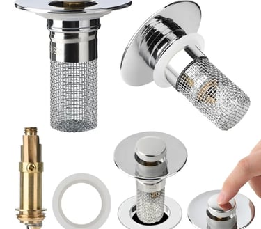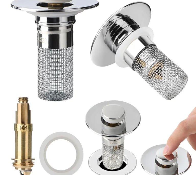 The 2pcs Pop-Up Sink Drain Stopper Set includes removable stainless steel filter baskets that effectively trap hair and debris. Designed for universal bathroom and kitchen sinks, it’s easy to install, durable, and keeps drains clean and clog-free.