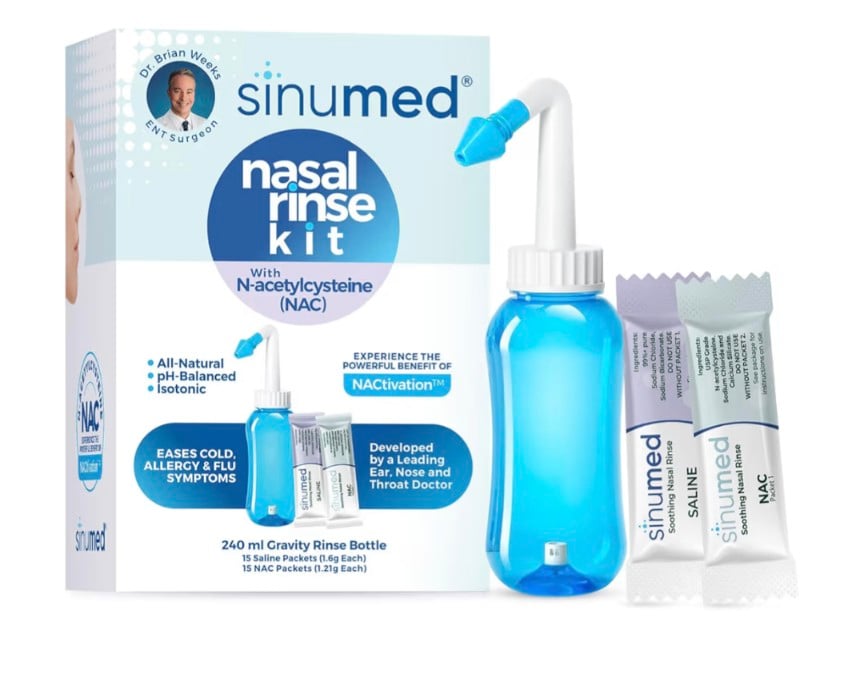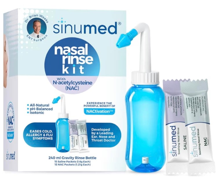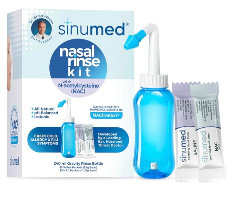A complete nasal rinse system with a gravity bottle and 30 NAC + saline packets to gently flush nasal passages. Helps relieve allergy irritation, congestion, and cold symptoms while offering an easy, neti-pot alternative for daily sinus care.