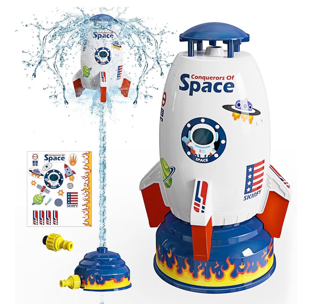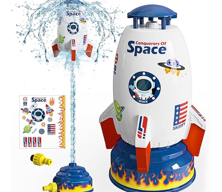 The Skirfy Sprinkler Rocket Launcher is a fun outdoor water toy that turns your garden into an exciting splash zone. Powered by water pressure, the rocket launches upward (up to 9–16 ft) and spins while spraying water in all directions, creating a playful and refreshing experience for kids.