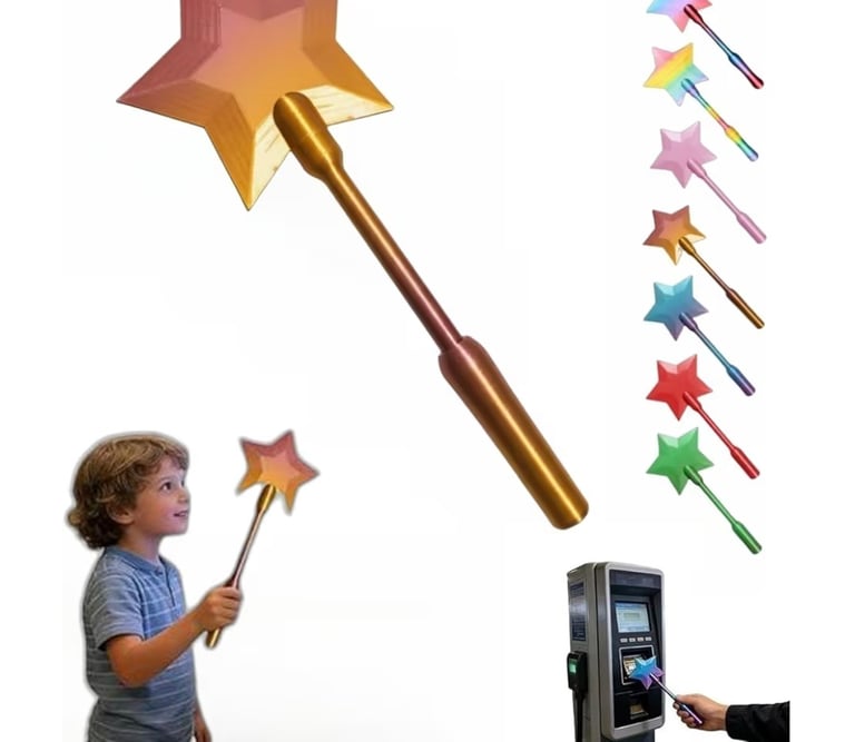 A fun and creative 3D-printed star wand designed to hold your contactless payment card, turning everyday checkout into a magical tap-to-pay moment. Simply insert your card inside the wand and tap at compatible payment terminals for quick, contactless transactions.