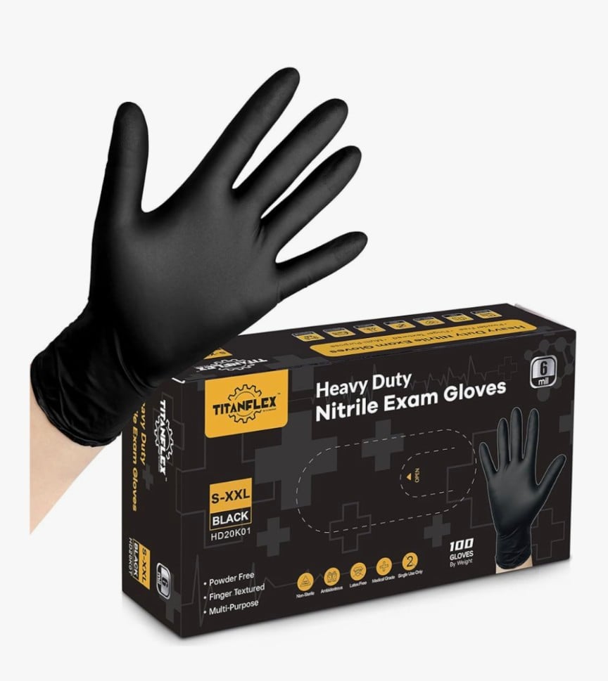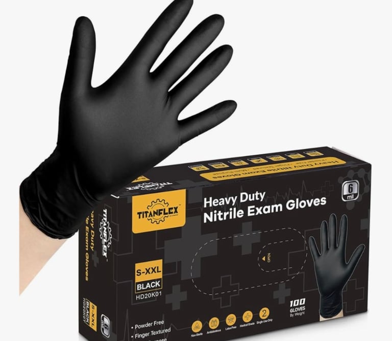 TitanFlex Disposable Nitrile Exam Gloves are heavy-duty protective gloves designed for professional and everyday use. Made from durable 6-mil nitrile material, they offer excellent resistance to punctures and chemicals while maintaining flexibility and comfort. Being completely latex-free, they are ideal for people with latex allergies. These black gloves are also food-safe, making them perfect for cooking, food preparation, cleaning, automotive work, tattooing, and medical or laboratory environments. Their textured surface ensures a secure grip, even when handling small or slippery items.