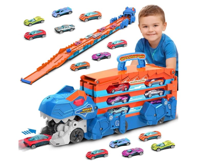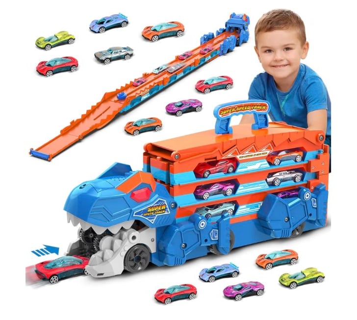 A fun and portable toy truck that transforms into an exciting dinosaur race track. It features an ejection folding design and comes with 8 mini race cars, helping kids develop imagination, hand-eye coordination, and motor skills. Easy to carry and perfect for solo or group play, making it an ideal gift for toddlers and young kids aged 3 to 7.
