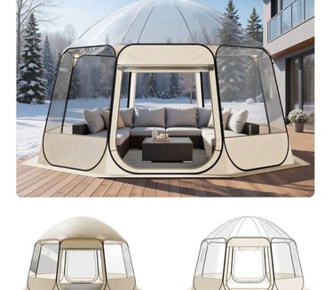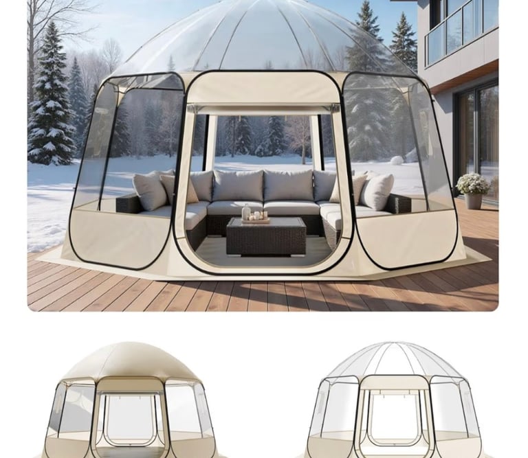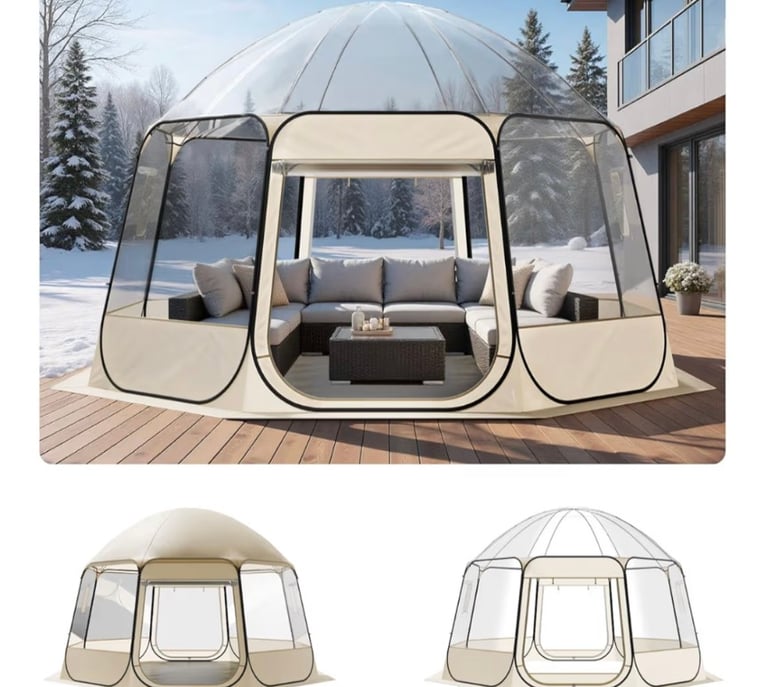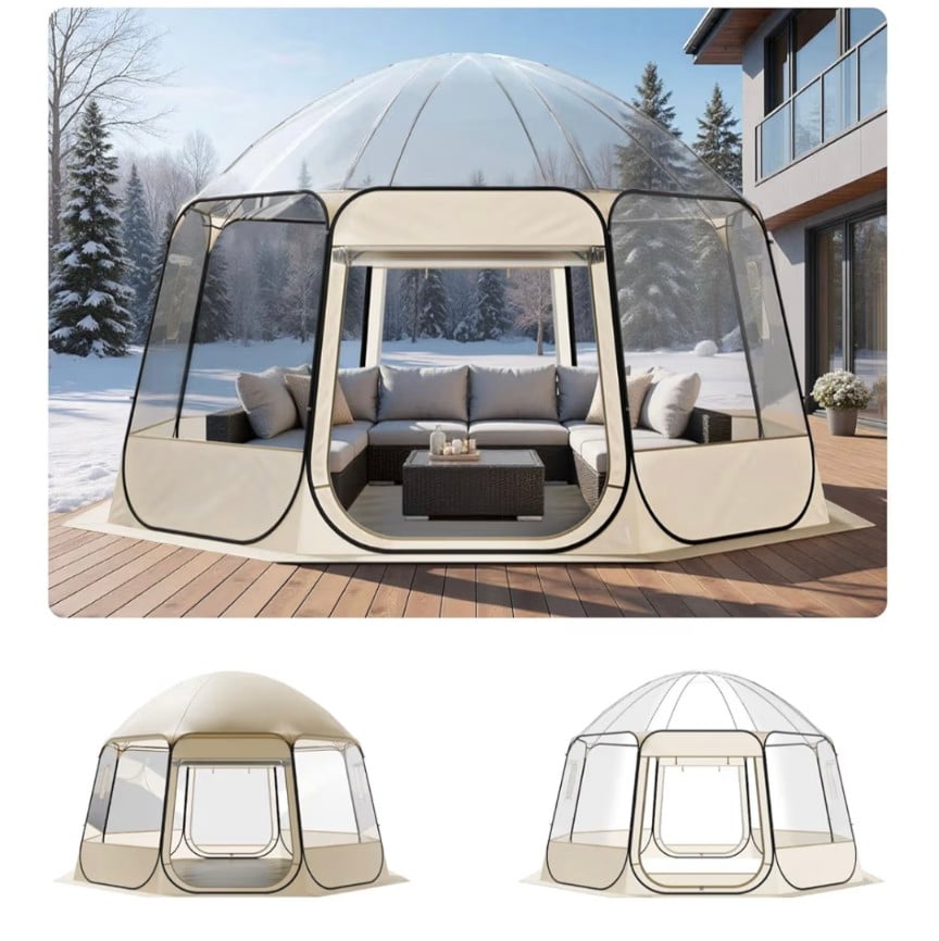 A transparent pop-up bubble tent designed for outdoor comfort and visibility. Available in 8 sizes for 1 to 6 people, this clear igloo-style tent is waterproof and wind-resistant, making it ideal for sports watching, garden use, camping, or backyard gatherings. It comes with a floor mat and top cover for added protection and quick setup without tools.