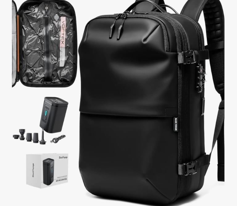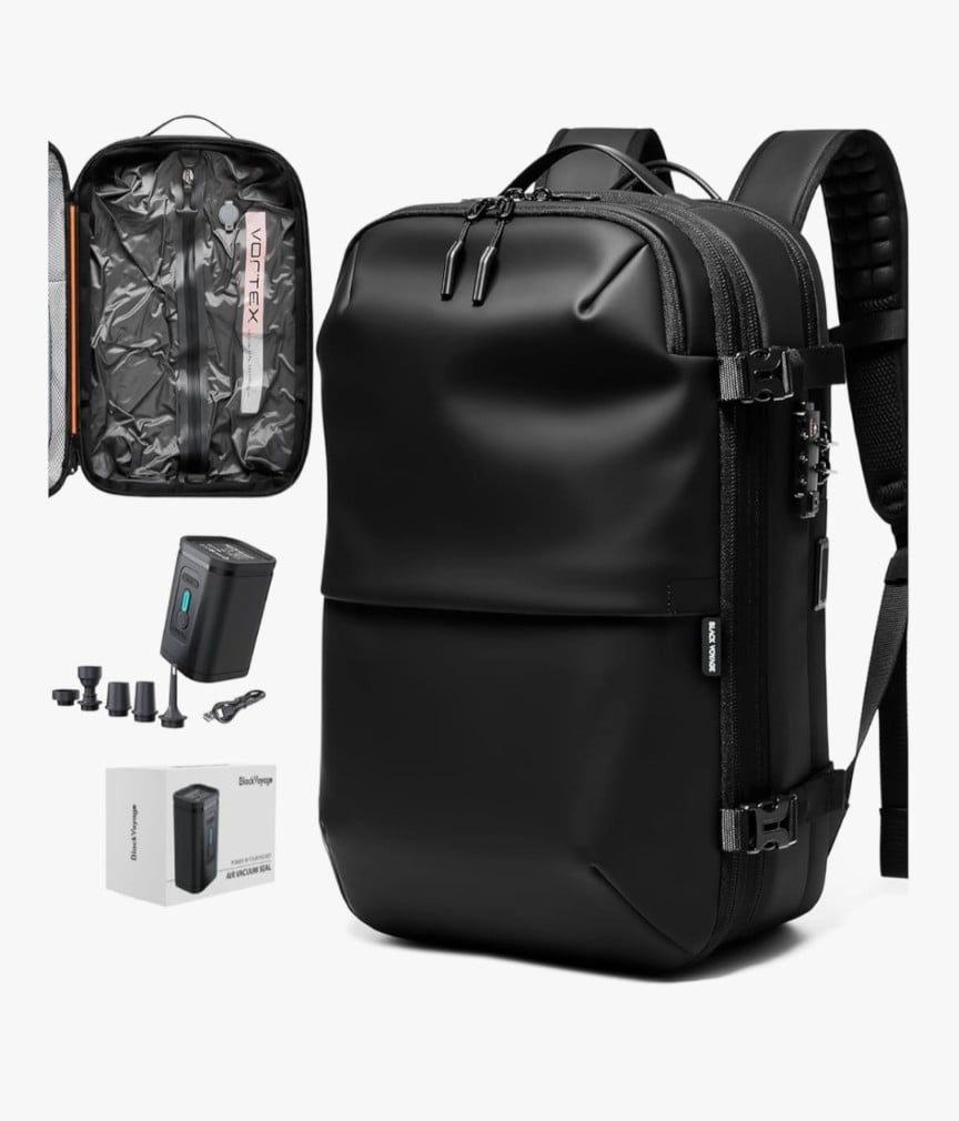 A high-capacity travel backpack featuring an expandable 60L design with a built-in air compression vacuum seal system to save space. Water-resistant and equipped with a TSA-approved lock, it works as a carry-on suitcase alternative. Includes a vacuum pump for quick compression, making it ideal for organized, secure, and efficient travel.