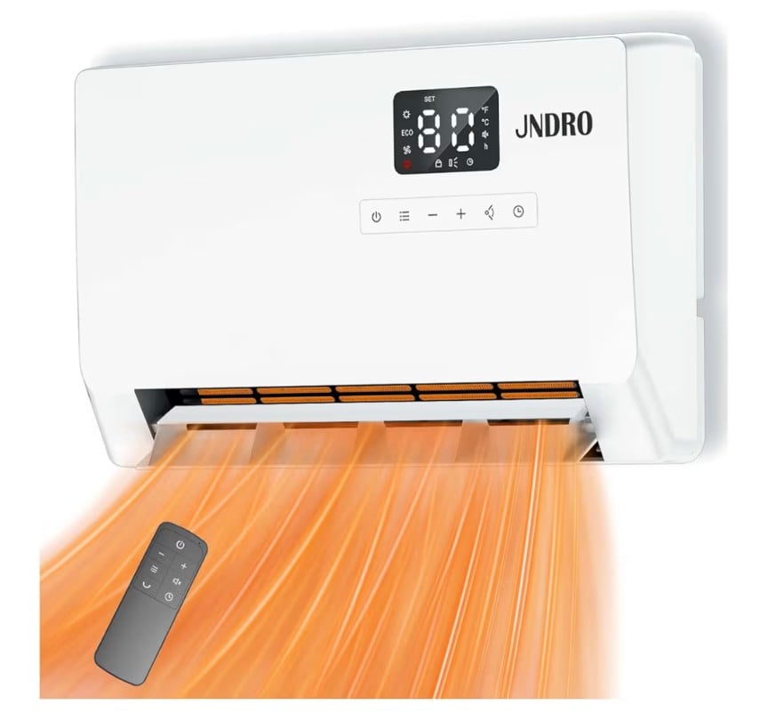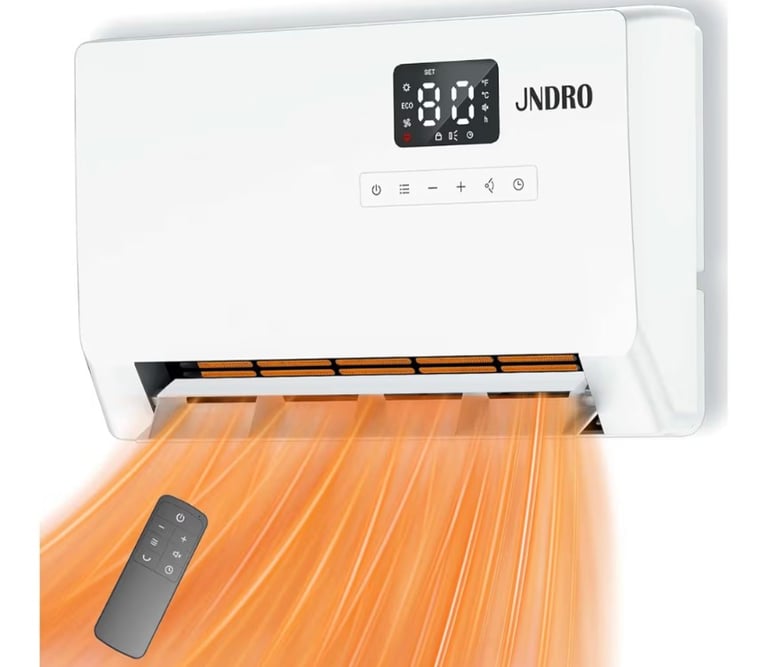 An efficient indoor electric space heater designed for wall mounting to save floor space. It features an ECO thermostat for energy-efficient heating, a clear LED display, multiple oscillation modes (60°/90°/120°), a 24-hour timer, and convenient remote control. Ideal for bedrooms, offices, and living spaces needing consistent, adjustable warmth.